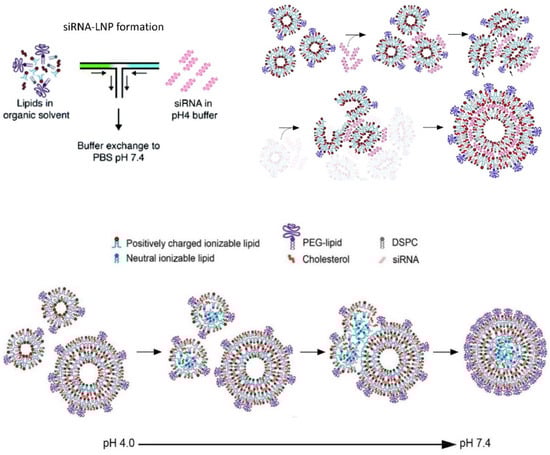 The development of ~70–90 nm-sized LNPs for the delivery of nucleic acids is the result of intensive research at universities and in industry, particularly focusing on the challenge to encapsulate—and thereby protect—nucleic acids in a particle that is non-toxic and efficiently taken up by target cells. Some of the essential steps of the work preceding commercialization were (i) the finding of a pH-sensitive cationic amphiphile that is able to complex anionic nucleic acids without being toxic, (ii) the selection of amphiphiles that are able to stabilize the LNPs in vitro as well as in vivo after administration before the target cells are reached, and (iii) the assembly of the LNPs in a reproducible and reliable way to the desired size and morphology. While (i) and (ii) are chemical challenges that had to be dealt with, (iii) is the engineering part, which is just as important as the molecular composition. LNPs are a specific type of polymolecular aggregates which are related to similarly-sized lipid vesicles (liposomes). Historically, intensive fundamental research on the aggregation behavior of polar lipids carried out by many research groups worldwide laid a solid foundation for the development of LNPs containing internal nucleic acids. LNPs emerged from studies on lipid vesicles (liposomes), from many challenging attempts to incorporate DNA or RNA inside lipid vesicles, for example, [6,7,8,9,10,11,12,13,14,15]. There would probably be no LNPs without the broad basic knowledge accumulated over the years on the chemistry, biophysics, engineering (methods of controlled and reproducible preparation), pharmacology, and immunology of lipid vesicles. On the other hand, the field of lipid vesicles emerged from the many fundamental studies on the phase behavior of amphiphilic lipids in the presence of water.