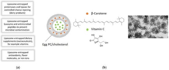 - Shukla, S.; Haldorai, Y.; Hwang, S.K.; Bajpai, V.K.; Huh, Y.S.; Han, Y.-K. Current Demands for Food-Approved Liposome Nanoparticles in Food and Safety Sector. Front. Microbiol. 2017, 8, 02398. [Google Scholar] [CrossRef] [PubMed]
