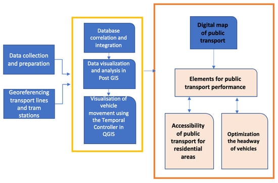 The digitization of the transport network by integrating the road network, stations and terminals, lines, transport schedules, the number of passengers, and accessibility is essential for carrying out analyses leading to the better adaptation to demands, increased performance and, thus, increased attractiveness of the urban public transport system. In recent years, special attention has been paid to the use of geographical information systems (GIS) for modeling mobility and transport studies [5,6,7].