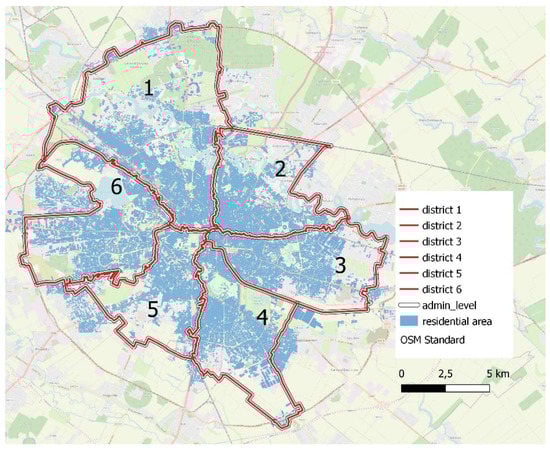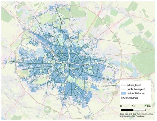 We used the residential area layer (extracted from OSM in Figure 2), indicating that these are generally uniformly distributed over the territory. We can observe that the density of the population varies between the districts (Table 1). Based on this map, we can estimate the penetration of public transport in the study area and the accessibility of public transport using the 400 m isochrone around the stops/stations.
