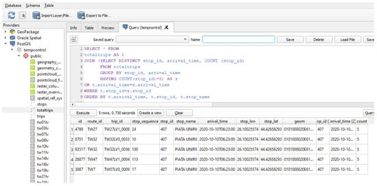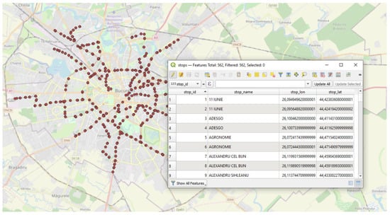 The integration and correlation of data were performed for all the tramlines by using open-source software (QGIS and PostGIS), resulting a database with more than 125,000 records, consisting of all the tramline schedules and stations (Figure 9).