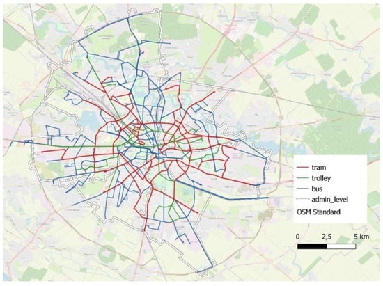 Elements of the transport network include fixed physical elements, such as the public transport network (lines, routes, infrastructure, stations, parking stations, and ticket/subscription selling points), and variable elements (vehicles, schedules, rates, transport capacities, and the number of passengers). We correlated the databases for lines, stations, and schedules to obtain an overview of the system. The transport lines were referenced in relation to the street layer and railway layer extracted from OSM and correlated with the information from the operator’s website [54] about public transport lines.