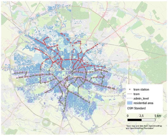 The transport lines and stations were georeferenced in relation to the street layer [51] extracted from OSM and correlated with the information found on the operator’s website [54] about the lines and the approximate positions of the stations’ locations on the city map.