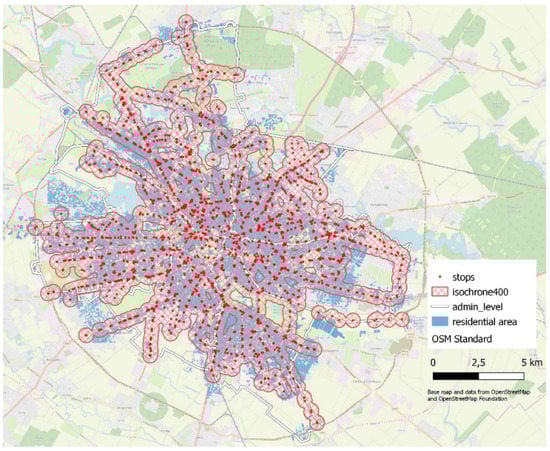 Since the accessibility of the public transport network influences travel demand and urban development [58], its evaluation is necessary for determining the performance of the public transport system. In Figure 8, we show the determination of the isochrones at a walking distance of 400 m (5-min isochrones) from each stop/station using the buffer feature of QGIS based on a fixed distance, considering an average pedestrian speed of 4.8 km/h. For the present research, we used radial isochrones, taking into consideration the fact that Bucharest has a plain topography, does not change much in elevation, has facile connections between main roads and public transport, and has dense residential areas.