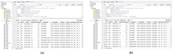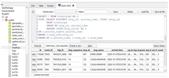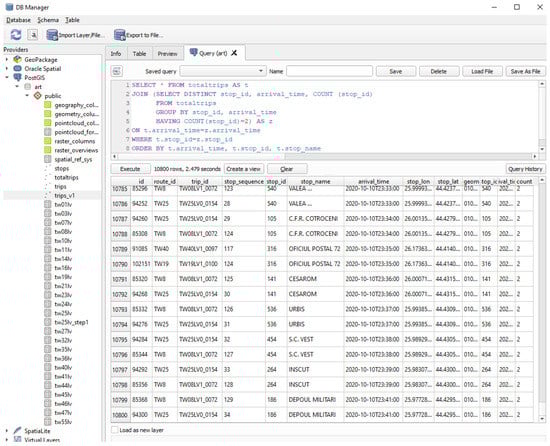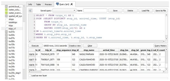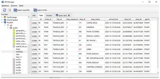 To create the view and animation in QGIS, we combined the tables in the database into a single table. The resulting trips table contained more than 120,000 records, only for the tram network. With the addition of the bus and trolleybus network, the number of entries would exceed 2 million, the database becoming quite extensive, making it necessary to support QGIS operations using PostGIS/PostgreSQL. Adding an index to the records in the database will help in improving the performance of queries, accelerating the retrieval of data, and ensuring uniquely identifiable records in the database. For the purpose of this study, only the visualization of the data was necessary. Loading stations were checked in the preview tab in DBManager or in pgAdmin (Figure 4).