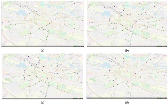 Tram position in several timeslots, each color representing the vehicle position for a specific tramline (e.g., light-green points represent the vehicles operating on tram line no. 8; red points, vehicles on tramline 21) (© OpenStreetMap contributors). (a) 05:01. (b) 07:51. (c) 16:43. (d) 23:21.