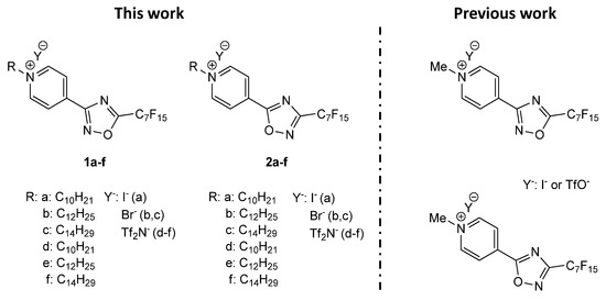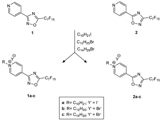 The salts 1a-c and 2a-c were synthesized according to Scheme 1 by 5-(Perfluoroheptyl)-3-(pyridin-4-yl)-1,2,4-oxadiazole (1) or 3-(Perfluoroheptyl)-5-(pyridin-4-yl)-1,2,4-oxadiazole (2) (100 mg, 0.1941 mmol) in acetonitrile (5 mL, Sigma-Aldrich, St. Louis, MO, USA) and by subsequent addition of 5 mole eq. 1-iododecane (98%, Sigma-Aldrich) (1a, 2a), 1-bromododecane (97%, Sigma-Aldrich, St. Louis, MO, USA) (1b, 2b) or 1-bromotetradecane (97%, Sigma-Aldrich, St. Louis, MO, USA) (1c, 2c), respectively. The mixture was stirred in an oil bath for one week at 80 °C. The reaction was monitored by TLC (petroleum ether and ethyl acetate 2:1 (Sigma-Aldrich and 99.9% VWR-Chemicals, respectively)). After cooling, the mixture was dried under vacuum. Impurities were extracted with petroleum ether (Sigma-Aldrich, St. Louis, MO, USA) several times and the product was dried under vacuum. Dissolving in acetonitrile (Sigma-Aldrich, St. Louis, MO, USA) and drying under vacuum yielded the desired products.