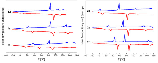 Figure 1. Differential scanning calorimetry (DSC) recorded for 1d-f and 2d-f showing the second cooling and heating curves with 10 °C min−1 under nitrogen atmosphere. Exothermic peaks point upward.
