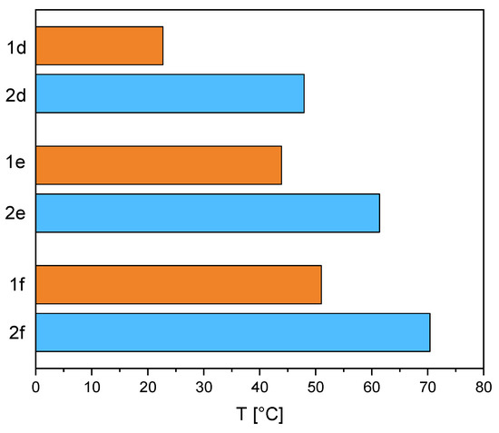 Comparing the enthalpy values within the series with each other (1d-f and 2d-f), they are quite alike for the second transitions, and no trend is visible. For the smaller peaks (first and third transition), the enthalpy values seem to rise, apart from a few exceptions (value of first transition of 1e and third transition of 2e). In general, the highest enthalpy values are calculated for the second transition of each salt. Since there are three relevant exothermic peaks in each DSC trace, it can be assumed that the samples exhibit LC phases or more than one crystalline phase. The first transition in the cooling cycle can be identified as the transition from the isotropic liquid into the liquid crystalline phase (I ⟶ LC) since the second transition in each DSC trace has too high enthalpy values to be a transition from a crystalline solid-state to another crystalline solid-state. The transition enthalpies of the second transitions, ranging from 12 to 19 kJ mol−1, are smaller than the reference values from a liquid crystalline phase to a crystalline solid-state transition (30–50 kJ mol−1), however, they are much higher than the values for transitions from LC to LC or LC to an isotropic liquid (4–6 kJ mol−1) [23]. This indicates that the second transitions can be assigned to a transition from a liquid crystalline phase to a crystalline solid-state (LC ⟶ Cr’’). The enthalpy of the third transition is smaller compared to the second transition and led to the assumption that a transition from a crystalline solid-state to another crystalline solid-state (Cr’’⟶ Cr’) takes place.