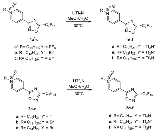 The perfluoroheptyl 1,2,4-oxadiazolylpyridine precursor (1) has been synthesized following the classical methodology of the amidoxime route (Yield = 48%) [18,19]. The regioisomer (2) with the reciprocal position of the perfluoroheptyl chain and the 4-pyridyl group with respect to the heteroaromatic core has been prepared according to the ANRORC method with a yield of 86% [20]. The quaternization reactions of these precursors have been carried out to obtain the series of perfluoroheptyl 1,2,4-oxadiazolylpyridinium salts (1a-c and 2a-c) by direct alkylation in acetonitrile with suitable alkylating agents. For this, 1-iododecane, 1-bromododecane and 1-bromotetradecane have been chosen. The success of the quaternization at the pyridine nitrogen of compounds 1 and 2 towards 1a-c and 2a-c (Scheme 1) was assessed by 1H-NMR (reported in the SI) and mass spectrometry (MS). Yields up to 93% have been obtained of the desired products. The metathesis from 1a-c and 2a-c with iodide and bromide or hexafluorophosphate (1a’, synthesis and analytical data reported in the SI, Figure S9) as counter ions has been realized in methanol and addition of the new desired counterion, here bis(trifluoromethane)sulfonimide lithium salt. Filtration and washing with water yielded the desired products 1d-f and 2d-f (Scheme 2). Detection of the new counterion bis(trifluoromethane)sulfonimide ([Tf2N]) has been done via HPLC-MS in a negative mode. Complete conversion from iodide/bromide/hexafluorophosphate to [Tf2N] has been guaranteed by HPLC-MS as no residues of the precursor counterions were detected.