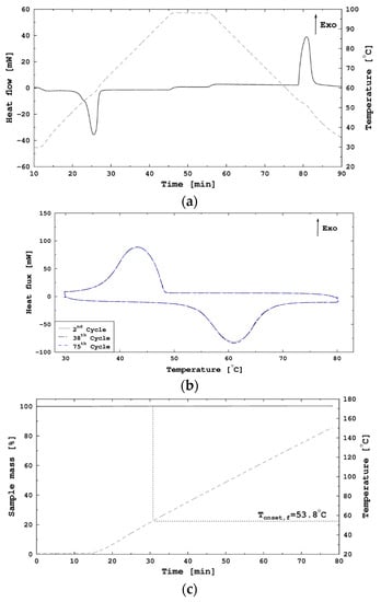 Figure 1c shows the thermogravimetric analysis of the SA–PA mixture (Setaram SETSYS apparatus). The melting onset temperature is plotted on the graph (53.8 °C). It can be noted that up to the final temperature of the experiment, i.e., 150 °C, no mass loss is evident.