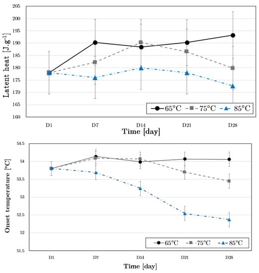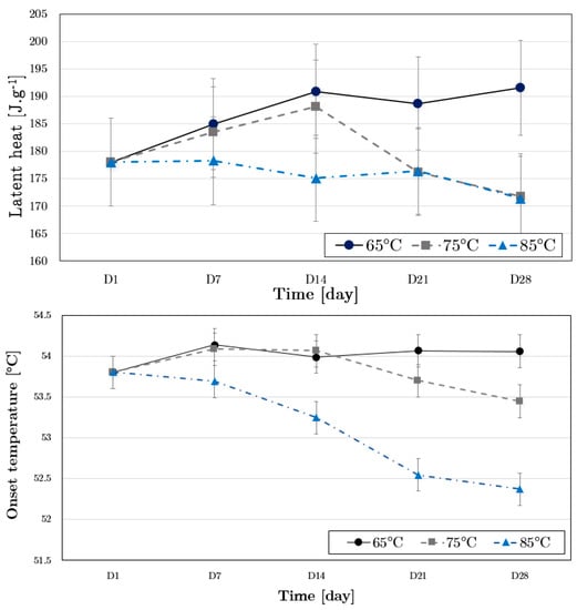 A disparity in latent heat values between the three temperatures is visible in Figure 2 after seven days, with 190 J/g for the sample placed at 65 °C, 182 J/g for the sample placed at 75 °C and 176 J/g for the sample placed at 85 °C. However, this difference remains at a value within the error interval throughout its thermal exposure, at all studied temperature levels. On the contrary, regarding the graph presenting the onset temperature as a function of time, differences are more noticeable between the samples. If the melting onset temperatures of the PCM placed at 65 °C and 75 °C are constant over time, the samples subjected to a temperature of 85 °C show a reduction of almost 2 °C between the reference time (D1), where the PCM is unaged, and the 28th day (D28).
