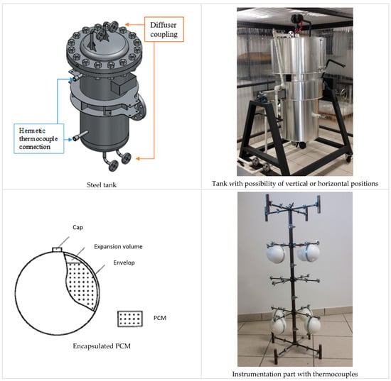 A prototype of a TES system has been built in the LaTEP laboratory and is presented in Figure 5. It is composed of a 0.1 m3 cylindrical tank (0.4 m diameter and 0.8 m length) made of steel and filled with spherical nodules that contain the SA–PA mixture studied in the previous paragraph. Water is used as the HTF. The tank can rotate around a horizontal axis so the test can be performed in vertical or horizontal positions.