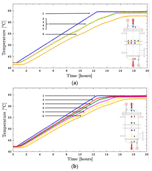 More than thirty charges and discharges have been performed on the lab scale prototype. During tests, no degradation of the system’s performance was observed. Figure 6 describes the results for a storage phase. The tank was set in the vertical position and the HTF flowed from the top to the bottom of the tank. The HTF was heated at a constant rate up to a temperature at which it was then maintained afterwards. The temperatures are presented for an experiment performed at a heating rate of 2 °C/h, a final temperature of 64.6 °C and a volume flow rate of 100 L/h. This highlights that the temperatures in the cylindrical tank were symmetrical and independent of the radius (Figure 6a). Furthermore, as illustrated in Figure 6b, the storage prototype worked perfectly as a piston-type system i.e., the temperature was constant on a section perpendicular to the fluid flow.