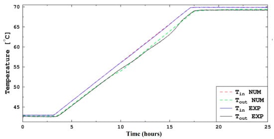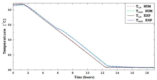 The outlet temperature of the tank started to increase almost 2 h after the inlet temperature had increased, which corresponds to the time it takes for the HTF to cross the tank. The stored heat was mainly in the form of sensible heat up until ~8h. After that, the phase change of the SA–PA mixture began, resulting in the change in slope of the temperature curves in the tank due to the latent heat. This is particularly visible in the curves recorded in the bottom of the tank. When all the PCM mixture had melted, the storage became sensible again (liquid phase) and the outlet temperature quickly reached its final value (lower than the inlet because of the prototype’s thermal losses). A similar behavior was observed during the discharge (cooling mode—see Figure 8). In both figures, the change in slope is not very large because the value of the latent heat of the PCM was quite low versus the sensible heat. This is due to the small volume of PCM that was inside the tank. The main reason is the instrumentation inside the tank, which severely reduce the space available for nodules.