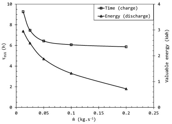 Different experiments have been performed to highlight the influence of the HTF flowrate and inlet temperature (Tin) during the storage and discharge phases. The studied parameters were storage efficiency ηstored and responsiveness τ95%. The latter is defined as the time required for the storage to reach 95% of the total charged or discharged energy. Specific results for storage phase are presented in Table 5.