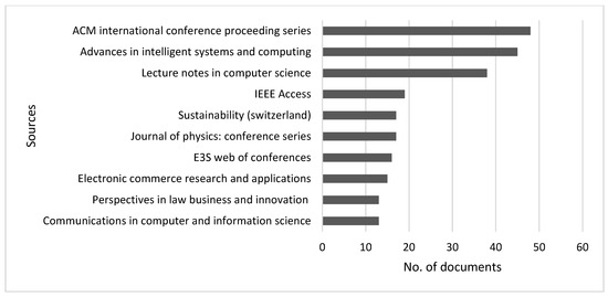 Figure 3 represents the top 10 critical influential sources of fintech literature. ACM International Conference Proceedings is the core source in the field. Contemporary research is often presented at the ACM international conference. The core source represents recent studies of diverse, agile tailoring models [16], the advanced mechanism for agricultural marketing and smart contracts using blockchains [17], and the facilitation of decentralised ledger technology for financial derivative markets [18]. T he second leading source of fintech literature is Advances in Intelligent Systems and Computing. This journal publishes literature on the digitalisation of the banking and insurance sector [19], introducing the QR-code-based payment systems at fintech future [20] and dynamic uses of blockchain technology such as e-voting [21]. The third primary source is lecture notes in computer sciences that involve literature on fintech innovation with patent data [22], the role of information technology (IT) in developing fintech business model canvases [23], and the use of fintech AI that is interpretable in evaluating the efficiency of lending risk [24]. IEEE access provides literature on the development of a blockchain-based microgrid transaction model for optimised bidding [25], market settlement models based on blockchain technology while securing efficient energy trading mechanisms [26], and contract production and transaction with dynamic technology such as a block-enabled integrated marketing platform [27].