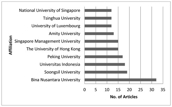 This section deals with the most relevant affiliations. As shown in Figure 4, Bina Nusantara University is the core affiliation, with 33 publications in fintech technology. The university evolved from a computer training institute founded on 21 October 1974 [46]. The affiliation conducts studies on asset baked tokens with blockchain networks [47], consumer protection in lending transactions [48,49], mobile payment application and acceptance [50], and unified theory of acceptance and use of technology [51].