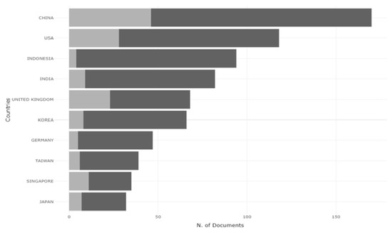 Figure 5 represents the top 10 corresponding author countries, and it is divided into two parts. The figure’s first part shows that the orange colour represents many multiple country publications (MCP). These publications are collaborated on by at least one foreign country author. Bars in green represent single country publications (SCP), where correspondence and collaborations are from the same country [61].