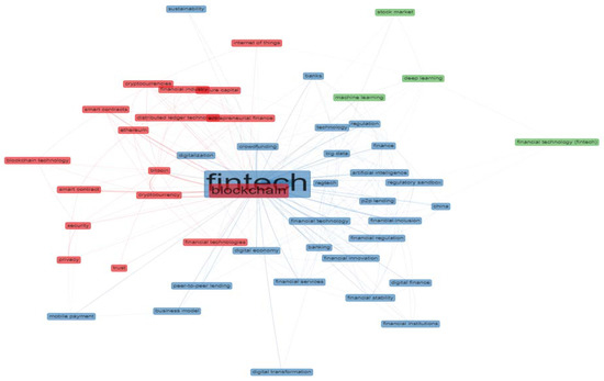 We have conducted the co-occurrence analysis using the author keyword and identified three main clusters of fintech literature, as shown in Figure 7. These clusters represent distinct research streams which can help the researchers to differentiate the literature significantly. A highly centralised cluster is a blue cluster representing the research stream we have given the name of digital transformation, innovation financial industry, and regulations. There are many topics to seek in this research stream, most prominently, the regulations related to analysing the application and implementation of fintech technologies. Skilful regulations are required for the outbreak of financial innovations throughout the economic systems [62].