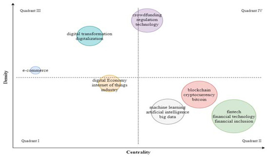 Digital economy, internet of things, and financial industry-related themes are in the first quadrant. These keywords represent the topic with low centrality and low density. These themes either emerge as a strong future agenda or drop out from the future literature.
