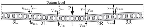 The load corresponding to the sequence L illustrated in Figure 11 was used as long-term loading. Uneven loads were chosen to verify the spatial work of the slabs and, in particular, the deflection curve and its shift towards the maximum load zone (panels number 6 to 10). The long-term tests of the deflections and panels faulting were scheduled for 12 months with a 30-day frequency for surveying the measurements.