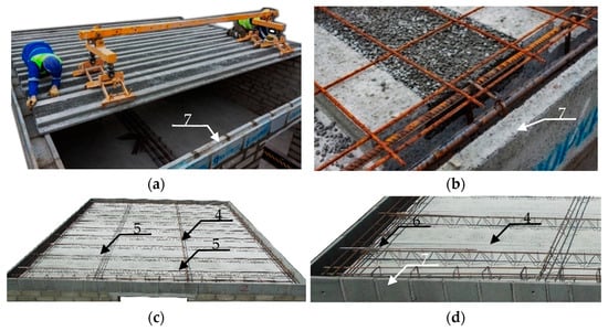 Research model: (a) ribbed panel laying; (b) ribbed panel support reinforcement; (c) lattice girder panel laying; (d) lattice girder panel support reinforcement. (1—wall, 2—lintel 2 × Scheme 7. 2/12/210, 3—lintel 2 × SBN 12/12/180, 4—lattice girder panel, 5—distribution ribs, 6—support reinforcement, and 7—precast bond beam form).