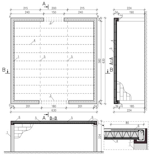 Geometric dimensions: top view, A–A cross-section, B–B cross-section (1—wall, 2—lintel 2 × SBN 7, 2/12/210, 3—lintel 2 × SBN 12/12/180, 4—lattice girder panel, 5—distribution ribs, 6—support reinforcement, and 7—precast bond beam form).