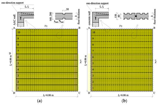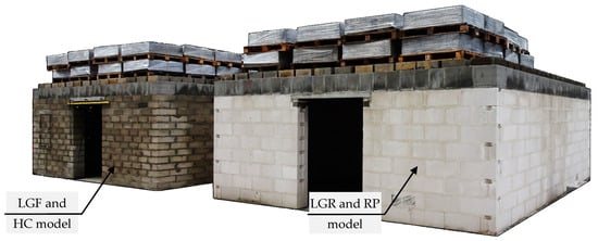 All the models were prepared as slabs with the dimensions of 6.30 m × 6.30 m supported on four masonry walls. The walls of the LGR and RP (Figure 2) models were made of concrete masonry units with a thickness of 240 mm and a height of 2.20 m. The walls of the LGF and HC models were made of autoclaved aerated concrete (700 density type) with a thickness of 240 mm and a height of 2.24 m (Figure 3 and Figure 4). The models were placed on a 300 mm thick reinforced concrete foundation slab that was previously used as a warehouse for heavy precast elements. Each model contained ten panels supported on precast bond beam blocks. The minimum support length was 80 mm. In addition, two door openings of 1.5 m and 1.8 m in width were created to provide access to the bottom part of the slab. The openings were covered with precast lintel beams, over which bond beam blocks were directly placed. The main erection stages and support zones before placing concrete topping are illustrated in Figure 2.