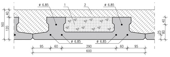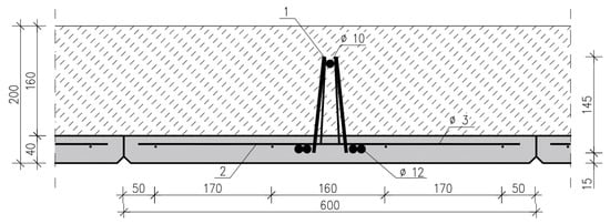 The third (RP) model was made of precast prestressed panels composed of the lower concrete slab with a thickness of 40 mm and a width of 600 mm, and two upward longitudinal ribs with a height of 120 mm at the centre-to-centre spacing of 350 mm (Figure 7). The prestressed reinforcement of ribs consisted of seven-strand tendons of ϕ6.85 mm (1 × ϕ2.24 mm + 6 × ϕ2.40 mm) from steel Y2060S7. Voids between ribs in each precast unit were filled with lightweight concrete of 80 mm in thickness. Then, the concrete topping of 40 mm thickness was laid after erecting of the members. The overall thickness of the slab structure was 160 mm. The top reinforcement (with the range of 100 cm) in the form of welded rebars a diameter ϕ4 mm, and spacing of 200 mm was erected at supports (Figure 2b). Two pairs of transverse rebars of ϕ10 mm were laid in the concrete topping on the rib (Figure 3). The deadweight of the slab was 3.15 kN/m2. Strength parameters of the applied materials are presented in Table 1 and Table 2.