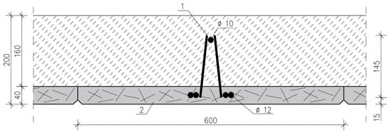 Cross-section of the slab with LGF panels: 1—lattice girder and 2—bottom plate with fibre reinforcement.