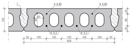 The fourth and last (HC) model was prepared from hollow-core slabs with a width of 600 mm and a thickness of 150 mm (Figure 8). Each slab was prestressed from the bottom with four tendons: ϕ9.3 mm (1 × ϕ3.17 mm; 6 × ϕ3.08 mm) and two tendons ϕ6.85 mm (1 × ϕ2.40 mm; 6 × ϕ2.24 mm) in the top part of the section. The thickness of the concrete cover of the top and bottom strands was equal to 35 mm. The concrete topping of the precast units was not intentionally used, and only the slab joints were in situ filled with concrete. At the supports, a rebar of 8 mm in diameter was laid in the joint. Each rebar was placed in the upper part of the shear key. The deadweight of the slab was 2.65 kN/m2. Strength parameters of the applied materials are presented in Table 1 and Table 2.