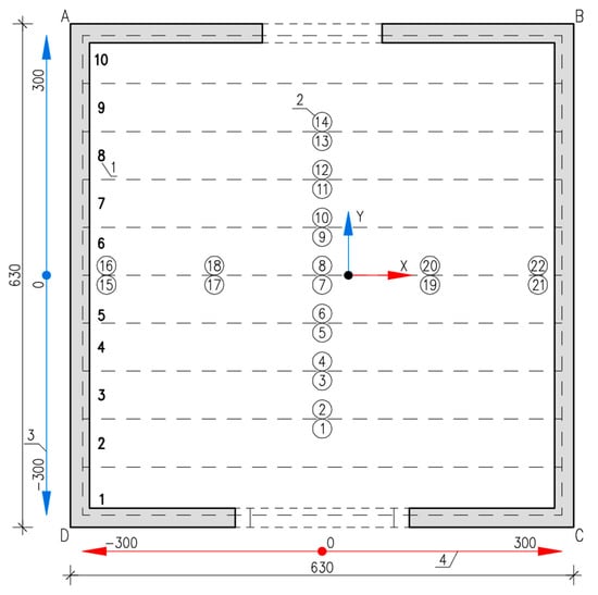 Arrangement of the transducer and geodetic sensors for measuring vertical displacements on the lower surfaces of the tested slabs: 1—panel number, 2—sensor number, 3—measurement direction transverse to the main direction of the panels (Y-axis), and 4—measurement direction along the length of the central panels joint (X-axis).