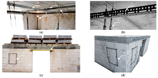 Overall view of sensors arrangement: (a) inside; (b) panel joint; (c) front view with lintel and wall measurement; (d) wall measurement. 1—steel frame, 2—LVDT sensor, and 3—geodetic marker.