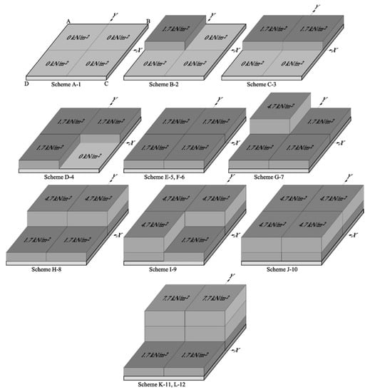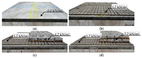 The load was applied to the test models following the loading schedule. The load was exerted by single concrete blocks (350 mm × 250 mm × 120 mm) and blocks placed on palettes. The total load exceeding the deadweight of the slab equal to 4.7 kN/m2 was divided into two parts equal to 1.7 kN/m2 (concrete blocks placed on the top of the slab) and 3.0 kN/m2 (the palettes with concrete blocks on previously laid concrete blocks) shown at Figure 11. In the last two schemes, the load was unevenly distributed, where half the panels had a load of 7.7 kN/m2, and the other half had a load of 1.7 kN/m2. The loading sequences are shown in Figure 12. The displacements were automatically read after positioning the load. After the sequence of E-5 and K-11 loads, an inspection was conducted for cracks. For this reason, an additional reading was taken under the same load configuration, E-6 and L-12, to show the changes in deflections during the inspection (about 1 h).