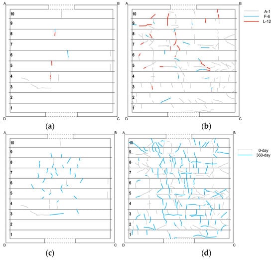 Crack patterns on bottom surface: (a) LGR 0-day; (b) LGF 0-day; (c) LGR 360-day (scheme L-12); (d) LGF 360-day (scheme L-12).