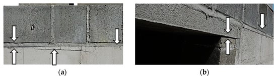 Cracks on the LGR model exposed to long-term loading: (a) in the interface between the bond beam and the masonry unit (corner B) and (b) between the lintel and the masonry unit.