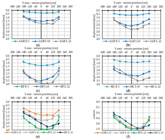 Displacements in the Y-axis for the sequences E-5, J-10, and L-12: (a) LGR; (b) LGF; (c) RP; (d) HC; (e) Comparison of panels and (f) performance of the panels in the Y-axis.
