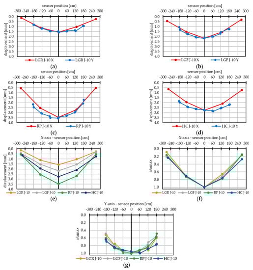 Displacements in the X- and Y-axes for sequence J-10: (a) LGR; (b) LGF; (c) RP; (d) HC. (e) Comparison of panels, (f) performance of panels in the X-axis, and (g) performance of panels in the Y-axis.