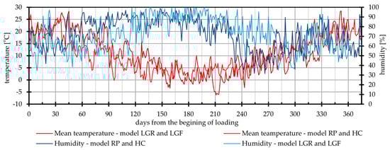 The long-term tests were performed under permanent loading (the sequence L-12), and the surveying measurements were taken at time intervals of one month. During the tests, temperature and humidity were measured (Figure 17). The results in the form of a graph presented in Figure 18 were based on the readings taken on days 100, 200, and 300 and after a year of loading. A regular increase in the displacements was found for the LGR and LGF models during the testing period. When compared to short-term loading, the displacements in the LGR model increased by 263% (day 100) and 315% (day 200), and those of the LGF model by 461% (day 100) and 536% (day 200). Contrary to the tests under short-term loading, the displacements in the RP and HC models were substantially smaller than in LGR and LGF after completing the long-term tests. Differences in readings between days 100 and 370 varied from 1 to 2 mm. The indirect measurement for the RP model on day 189 showed nearly the same deflection as on day 301. The first reading on day 113 and the second on day 197 were convergent for the HC model, except for one measuring point. The HC model exposed to long-term loading also differed in the displacement behaviour with reference to other models. The deflection line was shifted the most towards the maximum loading.
