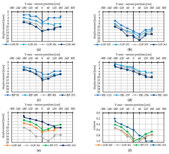 Displacement in the Y-axis during the load period for slabs made of (a) lattice girder panels with rebars; (b) lattice girder panels with fibre reinforcement; (c) prestressed ribbed panels; (d) hollow-core panels. (e) Comparison of panels and (f) performance of panels in the Y-axis.