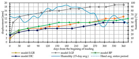 Figure 17 illustrates daily temperature and humidity readings separately for the LGR, LGF, RP, and HC models. The last two models were tested after a month interval from the ending of LGR and LGF research. The average humidity throughout the tests on the LGR and LGF models was 72.0%, and the temperature was equal to 10.9 °C. For the LGR and LGF models, the average humidity and temperature did not significantly differ and were equal to 71.8% and 10.7 °C, respectively. During the period of increased humidity (>90%), a minor increase in displacements was recorded (days 150–240) compared to in other periods. There was no effect of temperature on the increase in displacements and crack patterns. The mean value of humidity during the test was used in the calculation of long-term displacements. Figure 19 presents the maximum displacements for each model during all measurements. According to [55,57], most displacements are observed during the first 100 days, and the largest increase is found during the first 30 days after the load is exerted.