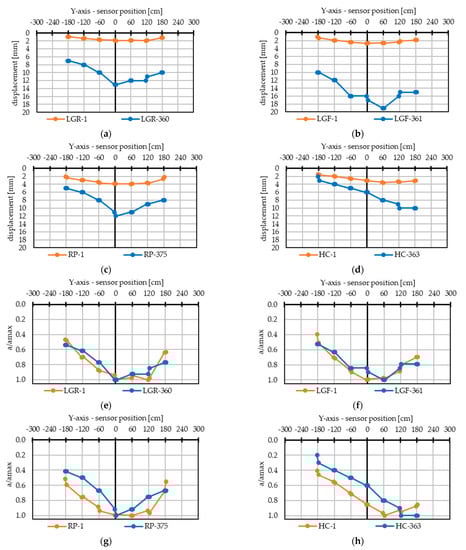 Graphs in Figure 16a,b show the comparison of displacements of the measured points on X- and Y-axes (longitudinal and lateral directions) for the sequence J-10. The displacements in the LGF model were 39% greater than those in the LGR model and 26% greater in the RP model compared to the HC model. The displacements in the LGR and LGF models demonstrated high similarity along the two axes. Similar behaviour was observed for the RP model. However, a different flatter displacement curve was observed for the HC model. The observed deflections near the supports were relatively higher than in the case of the other three models. Moreover, only the HC model did not have the maximum deflection at the midspan but at a distance of 0.625 m from the midpoint. The HC model, the only one made without concrete topping, showed behaviour closer to the model of the hinge joint between panels, consistent with that presented in Figure 1 and adopted in the standard [52]. Such a model justifies greater displacement closer to the support, resulting from greater rotations in the shear keys between the panels closer to the support. The maximum displacements of individual models are compared in Table 4.