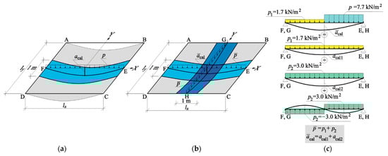 Slab models used in calculations: (a) the beam model; (b) the slab model; (c) the principle of establishing the equivalent loading of the slab under non-symmetric loads.