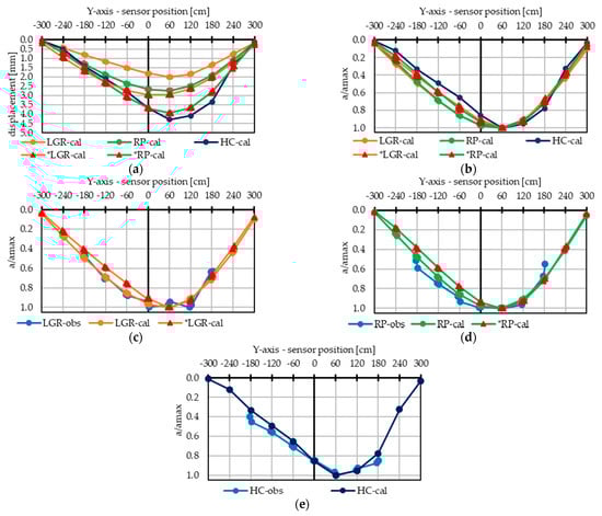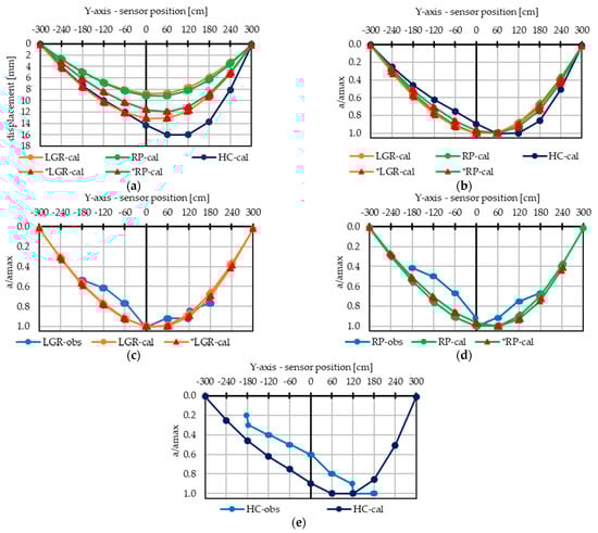 Comparisons of the displacement in the Y-axis between FEM calculation and short-term measurements: (a) calculated displacement; (b) calculated performance of panels at Y-axis; (c) LGR performance; (d) RP performance; (e) HC panels performance. obs—observed deflection, cal—deflection with a thickness hred caused by short-term loading, *cal—deflection with a thickness *hred caused by short-term loading.