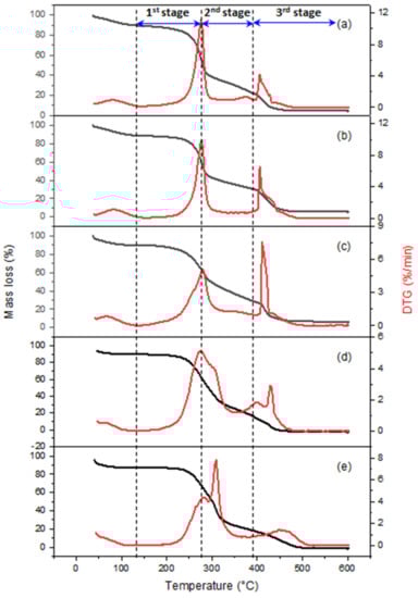 TG (black curve and y-axis on the left side) and DTG (red curve and y-axis on the right side) profiles of untreated residues of (a) cassava, (b) yam, (c) coconut, (d) corncob, and (e) cornhusk.