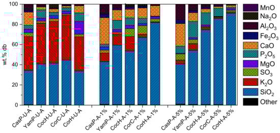 The changes in elemental composition upon treatments (1 and 5 w/v% citric acid (CA)) of the biomass fuels are shown in Figure 4. The results indicated that in untreated ash samples, the share of oxides of silica, potassium, sodium and calcium are in higher proportion compared to other ash forming elements (such as Al2O3, CaO, K2O, MnO, etc.). Acidification of the biomass fuels proved to be effective in removing the above metals to substantially lower levels, as the main component of the samples was SiO2. The reduction in the metal impurities after the pre-treatment process could be attributed to the dissolution of weakly and strongly bonded metals within the organic matrix of the biomass fuels [89], and the volatilization of metals that occurred during the thermal decomposition process [90]. Nevertheless, the ashes of some of the samples contained a considerable amount of potassium and oxides of Al constituents relative to silica even after the acidic pre-treatment. These observed effects align with similar observations made by Alyosef et al. [89] during their investigations on Egyptian diatomite.