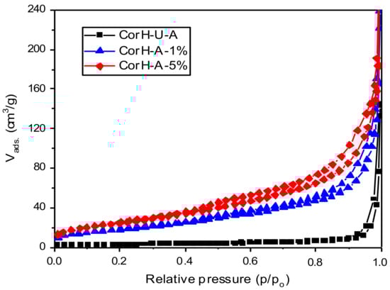 The isotherms for the CorH-U-A, CorH-A-1% and CorH-A-5% are given in Figure 6 as examples since the other samples show similar behaviour; the corresponding textural properties data along with the different samples are summarized in Table 4. For the treated samples (CorH-A-1% and CorH-A-5%), the isotherms exhibited a common characteristic of type IV(a) isotherm according to the IUPAC classifications [115], with a small knee at p/p0 = 0.05. They showed an H3 apparent hysteresis loop with closure points around p/p0 = 0.40, which is often associated with the effects of capillary condensation in non-uniform pore arrangements [116,117]. In addition, the presence of hysteresis loop in isotherms has been attributed to the presence of larger mesopores in the ash, which can only be accessed through the smaller mesopores [115]. Furthermore, the isotherms followed a similar path at the lower regions, and the amount of nitrogen adsorbed increases when approaching the saturation vapour pressure (p/p0 = 1). The absence of an apparent plateau close to p/p0 = 1 implies the presence of larger meso and macropores, which cannot be fully filled with the nitrogen condensate [47] and/or the presence of interstices between particles.