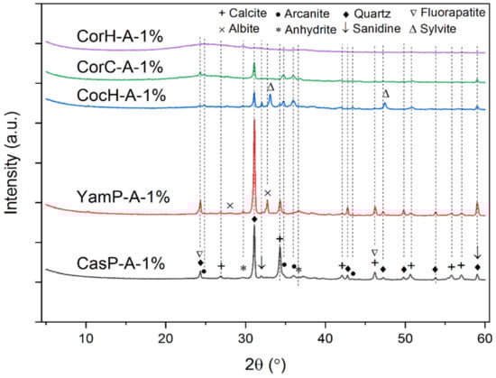 Figure 7 shows the XRD patterns and crystalline phases identified in the ash samples of the biomass fuels pre-treated with 1 w/v% citric acid. In all the ash samples, the following dominant phases were detected: quartz (SiO2), calcite (CaCO3) and anhydrite [Ca(SO4)]. The presence of these dominant phases has also been reported during the investigations of wheat straw, miscanthus and cereal remnant pellet, all leached in hot solution of sulfuric acid [20]. Other minor crystalline phases, such as feldspar of the plagioclase series such as albite [Na(AlSi3O8)], were found in cassava and yam peelings as well as coconut husk in addition to an amorphous fraction. Potassium feldspar, such as sanidine (KAlSi3O8) was clearly detected in CocH-A-1%. The formation of sanidine (KAlSi3O8), as reported in the study of Alyosef et al. [20] could be as a result of a thermodynamic effect (i.e., “back-formation” of feldspar or arcanite) that reduces part of the amorphous silica particles [10,100]. The major differences in the XRD patterns of the samples were that of the CorC-A-1%, CorH-A-1%, which were characterized by a clear and dominant amorphous component with traces of arcanite (K2SO4) and anhydrite [Ca(SO4)], respectively. These last two phases are because of the remaining low impurities of K2O and CaO present in the ashes, as confirmed by the EDX spectrum of the CorH-A-1% sample in Figure 8.