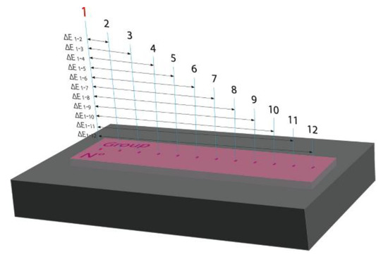 Beforehand, the color acceptability threshold was experimentally evaluated. Regarding each sample (n = 48), a first point was defined as the sample color standard (Figure 1). From this standard point, eleven measurements were taken every 0.5 mm and were each compared to the standard point to determine ∆E. The results met the color acceptability threshold for acrylic denture base resins recently determined by Ren et al. (ΔE00 < 4.00) [47].